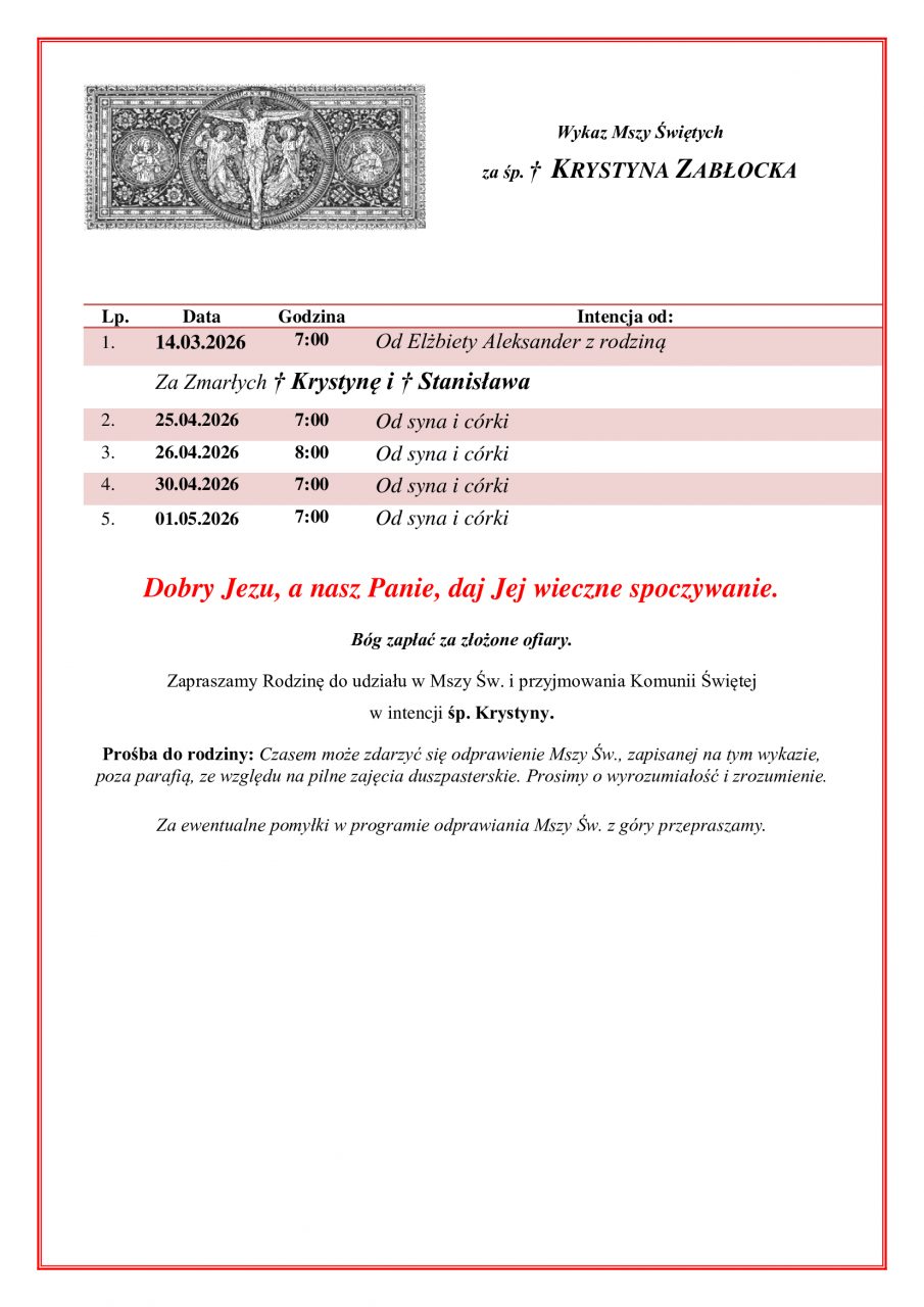 Intencje mszalne za duszę śp. Krystynę Zabłocką