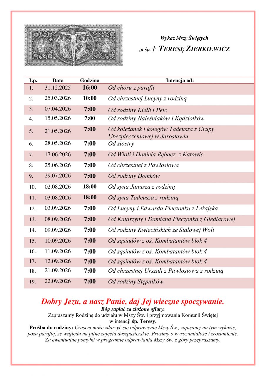 Intencje z pogrzebu za duszę śp. Teresę Zierkiewicz