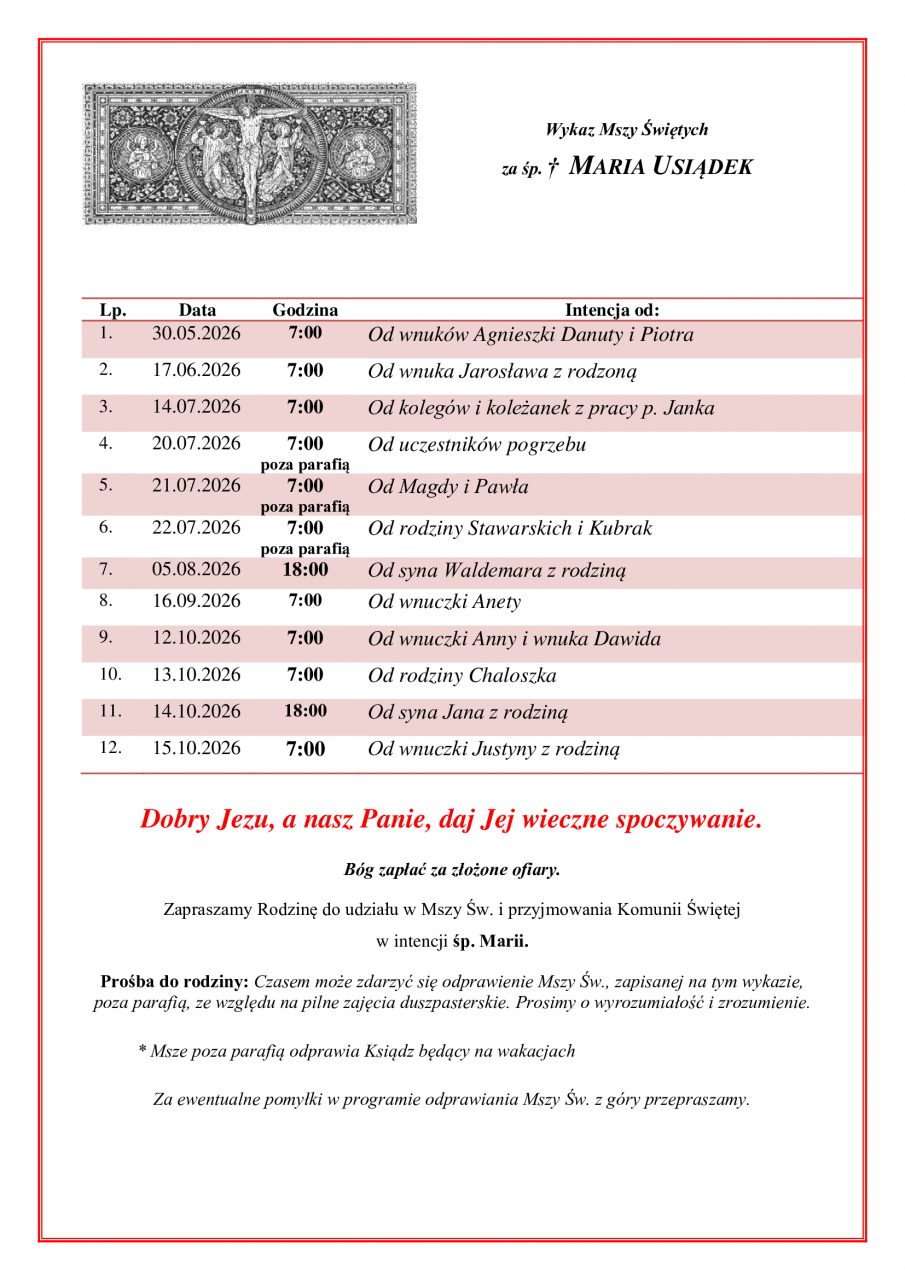 Intencje z pogrzebu za duszę śp. Marii Usiądek