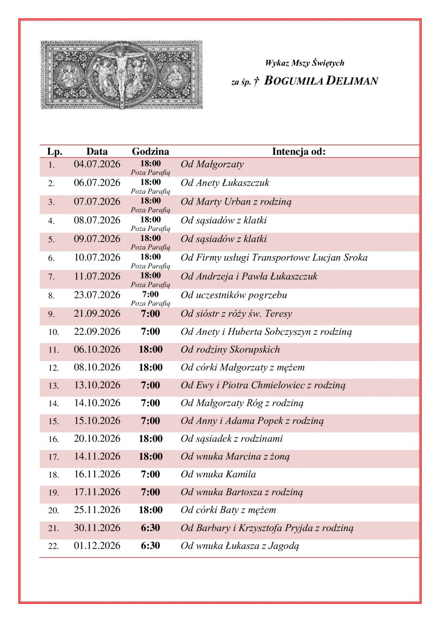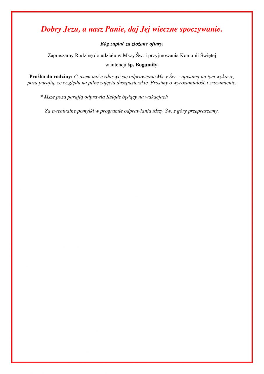 Zapraszamy osoby oraz rodziny zamawiające Najświętszą Eucharystię do uczestnictwa i ofiarowania w intencji zmarłej modlitw i komunii świętej.